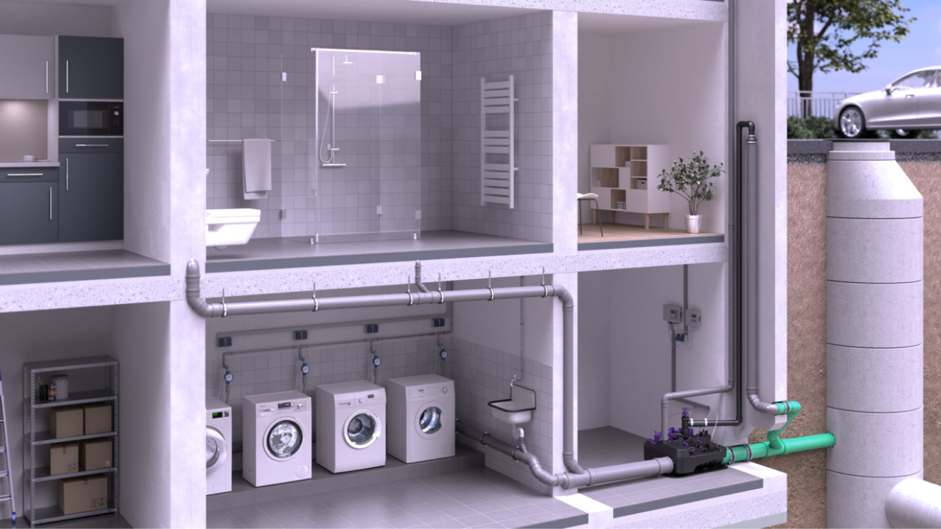 The Ecolift L takes advantage of gravity: Due to the natural gradient, it diverts wastewater without consuming electricity. It uses the pumps for wastewater disposal only in the event of backwater. This saves energy and at the same time protects the environment. Perfect for energy-related renovations!