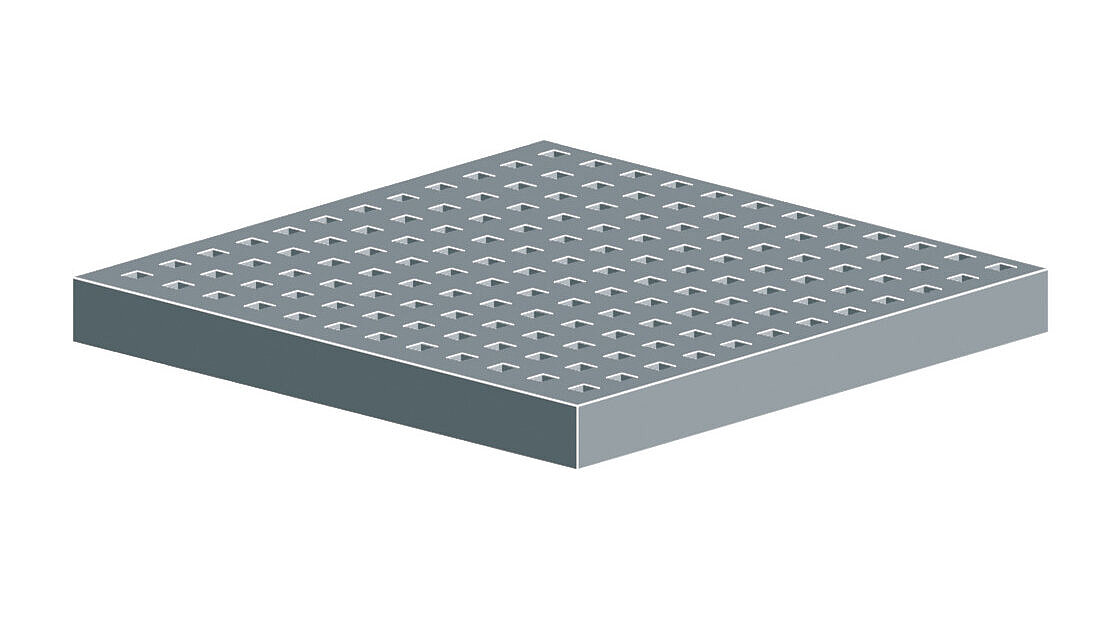 Suitable for barefoot areas, brushed surface, anti-slip R 12 (DIN 51130), assessment group C (DIN 51097), holes 8× 8 mm, insertion depth 25 mm, thickness 2 mm, class K 3